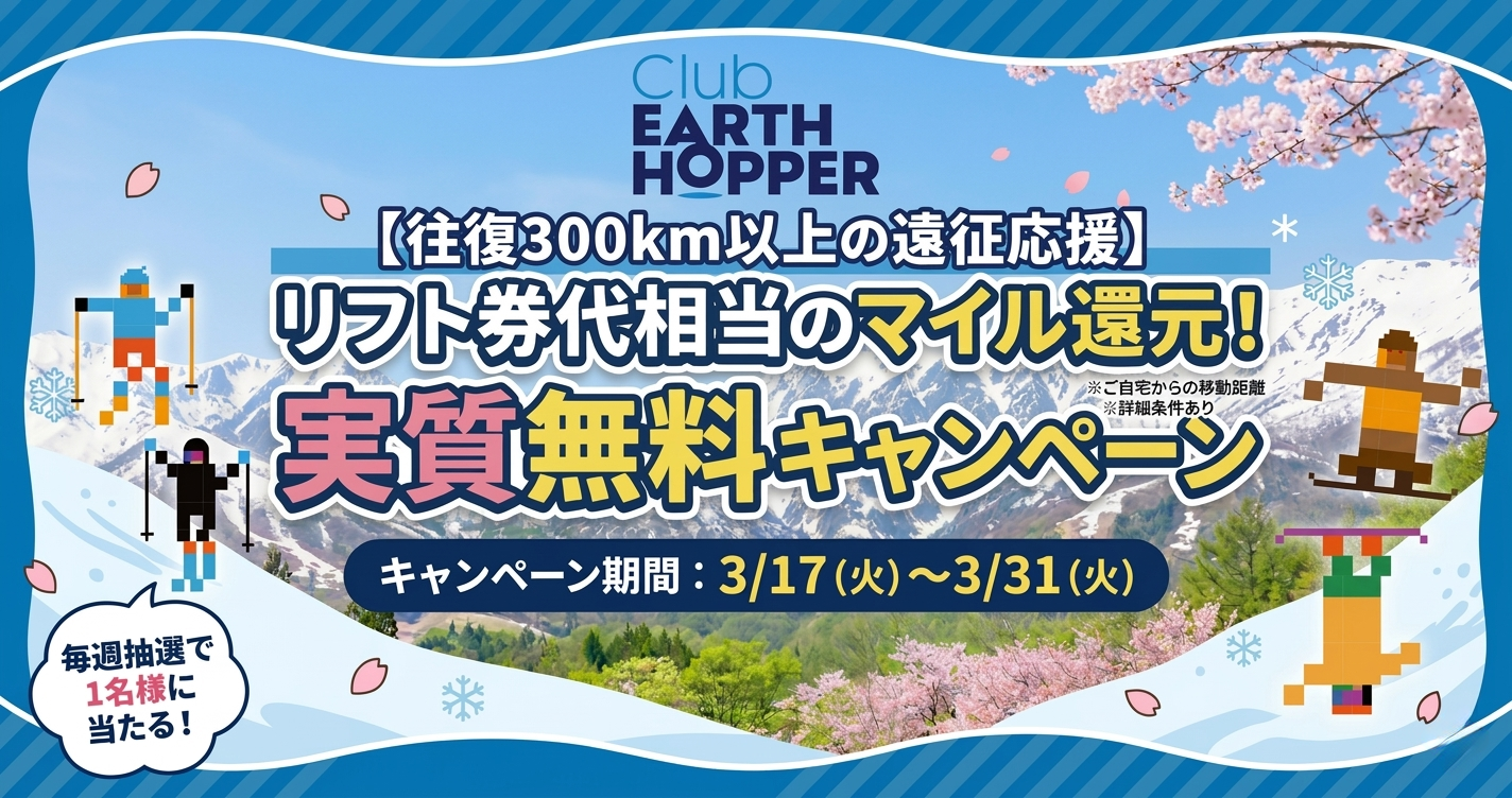 株式会社アースホッパー(以下「当社」といいます)が企画・実施するキャンペーン「3月後半限定・リフト券代相当マイル還元!実質無料キャンペーン」(以下「本キャンペーン」といいます)にご参加いただく前に、本応募規約をよくお読みください。なお、本キャンペーンの対象アクション(リフト券の購入および利用)を行った方(以下「応募者」といいます)は、その時点で以下の内容にご同意いただいたものとみなします。