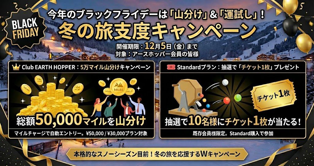 2025年のブラックフライデーは、皆様の冬の旅を応援する「山分け」と「抽選」のWキャンペーンを開催いたします!