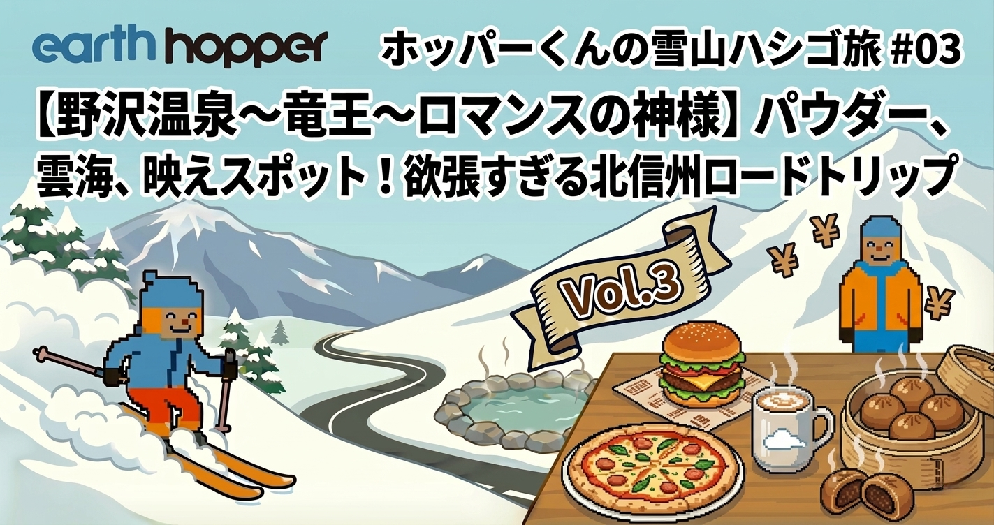 アース先輩: 「今回は『伝統』『絶景』『最新』という、全く異なる個性を持つ3つのスキー場を巡る黄金ルート。アースホッパー提携外のスポットも交えながら、北信州の魅力を遊び尽くす欲張りプランだ!」